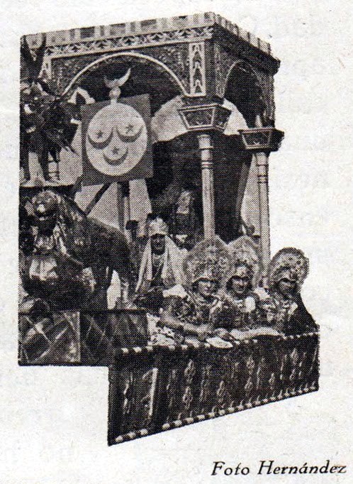 Gracias a los tres “fotogramas” de escasa calidad de 1930 que hacen referencia a las carrozas que salieron en 1928, conocemos la fisonomía de las carrozas de Marruecos, Marineros y Estudiantes. Por lo que se refiere a los marruecos hablamos de la primera carroza “del Sultán” que con ajustes desfiló desde 1928 hasta los años 60; posteriormente lo harían otras propias o alquiladas con el mismo nombre. Se llamaba “del Sultán” porque la coronaba “el Sultán” marroquí que, a todas luces, surgiría su figura al mismo tiempo que su carroza. La pregunta es, ¿apareció la carroza marroquí “del Sultán” en 1926, 1927 ó 1928? En 2026 demostraremos por activa y por pasiva que lo hizo en 1928, siendo presidente un gran arrastrao: don Fernando Estevan Martínez “Calañés”.