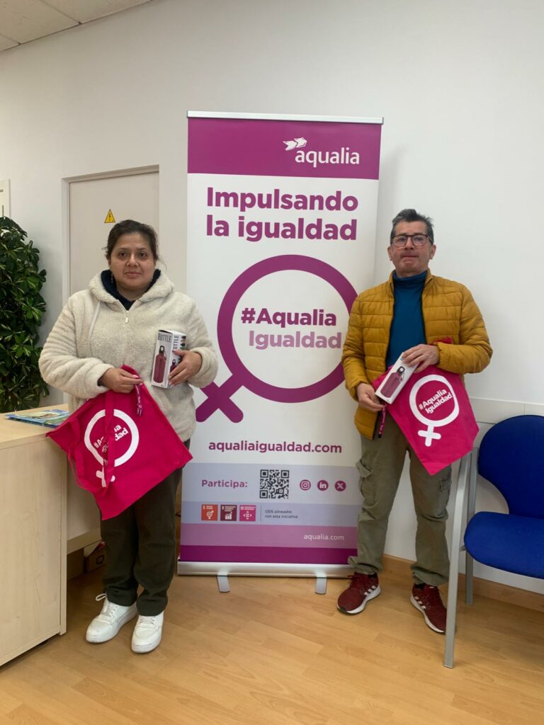 A las personas que han pasado esta semana por la oficina de Atención al Cliente se les ha repartido una botella reutilizable, una bolsa y pulseras con el logo de la campaña #aqualiaigualdad con el objetivo de “que este día tenga repercusión en la sociedad para concienciarnos de la importancia capital de la mujer en la sociedad y la necesidad de que haya una igualdad real en las condiciones laborales de la mujer trabajadora” – ha indicado Gabriel Morales, responsable de Aqualia en Villena.