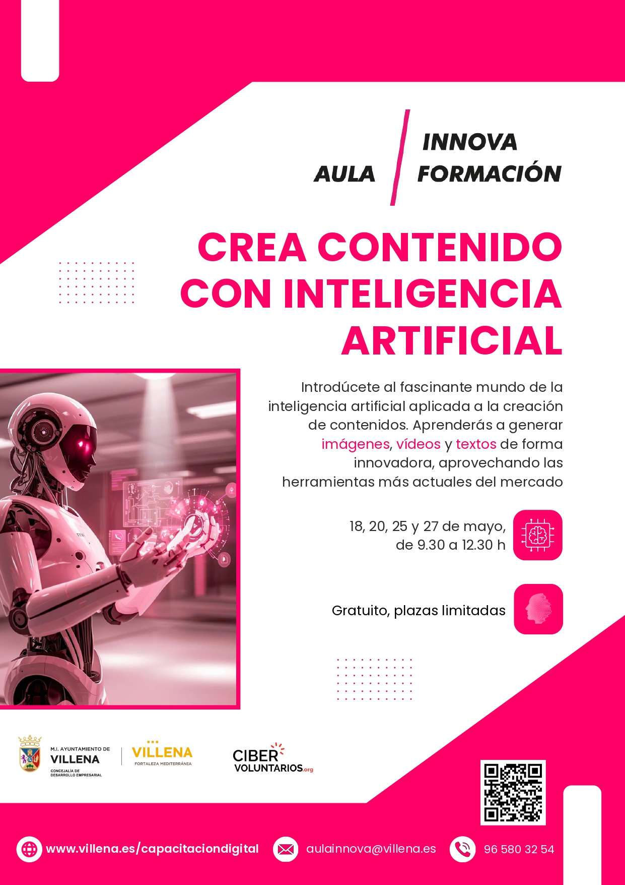 Aula Innova Formación ofrece el curso de 12 horas, gratuito para todos los públicos, ‘Crea contenido con Inteligencia Artificial’. El plazo de solicitud se cierra el próximo 29 de abril, y las solicitudes de inscripción se pueden tramitar desde la web www.villena.es/capacitaciondigital, el email aulainnova@villena.es o en el número de teléfono 96.580.32.54.