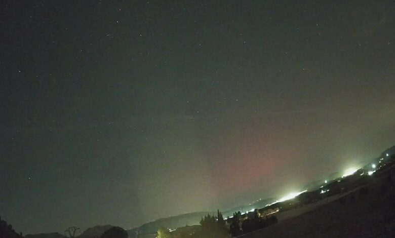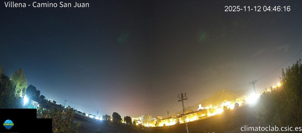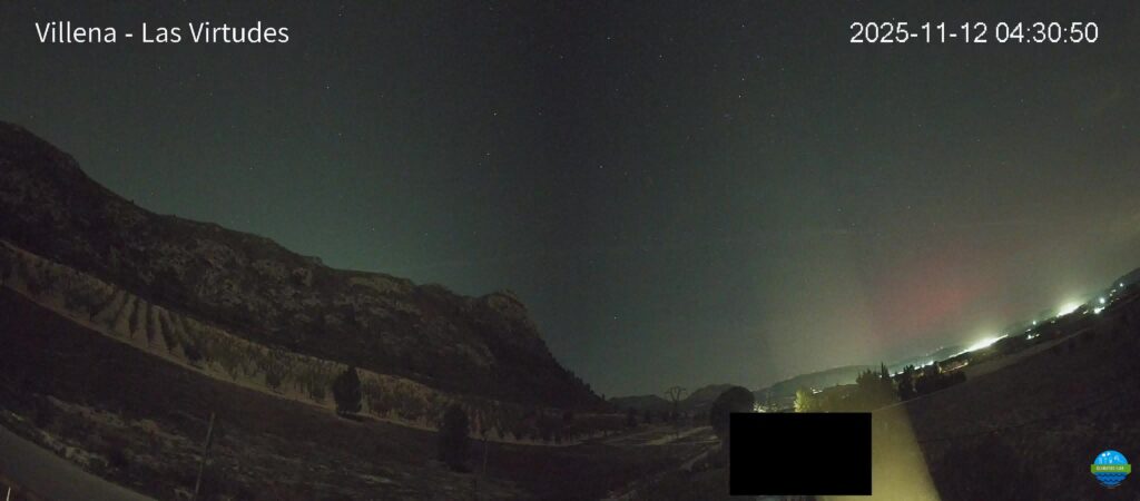 Villena ha vuelto a ser testigo de un espectáculo poco común en el cielo mediterráneo. Durante la madrugada de este miércoles, entre las 4 y las 5 horas, las webcams meteorológicas ubicadas en nuestro término captaron una aurora boreal visible desde nuestra ciudad, generada por la tormenta solar X5.1 registrada en las últimas horas.