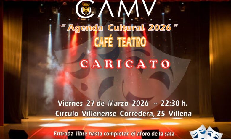 La Agenda Cultural del Círculo Agrícola Mercantil Villenense (CAMV) continúa ofreciendo nuevas oportunidades para el talento escénico local. Este viernes 27 de marzo de 2026, el grupo Caricato Teatro subirá al escenario del Círculo Villenense con una propuesta original de café teatro, compuesta por cuatro representaciones de teatro breve, acompañadas de música en directo a cargo de Pepe Cabanes y diversas sorpresas para el público asistente.