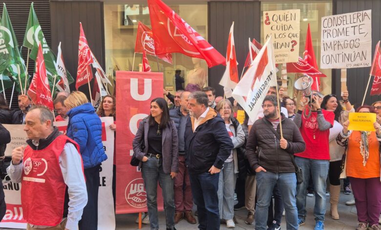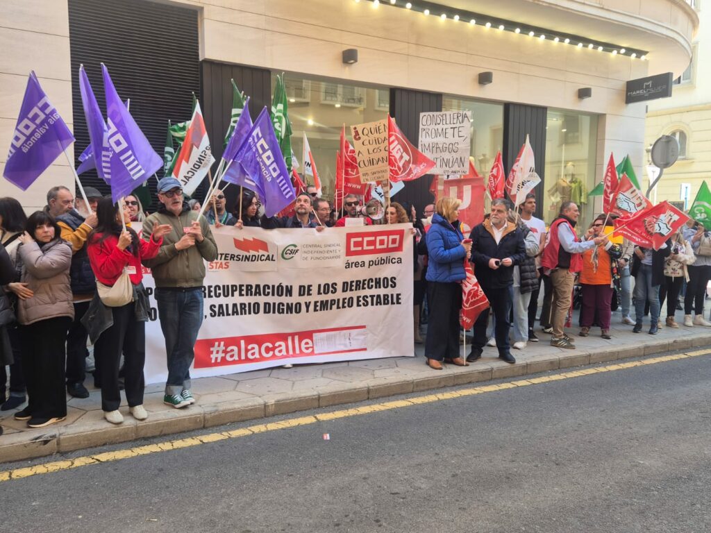 La concentración se ha realizado ante los servicios territoriales de la Conselleria de Servicios Sociales, convocados por las principales fuerzas sindicales, donde la plantilla laboral sufre el impago de las denominadas ‘nominillas’, el pago de los servicios extraordinarios de los trabajadores y trabajadores, cantidades de deuda que ascienden de media a 1.500 euros en los últimos ocho meses.