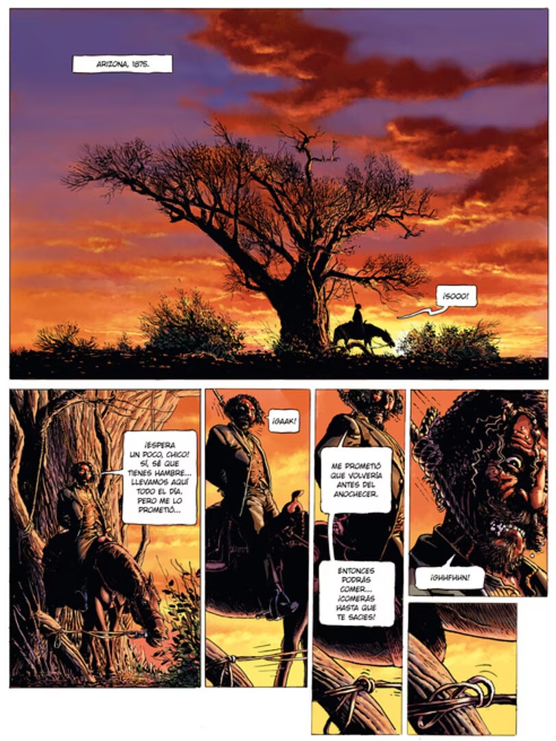 Finalmente, cambiamos de tiempo y lugar yéndonos a los Estados Unidos de América de finales del siglo XIX en uno de los mejores wésterns que nos ha ofrecido la historieta europea, y que está a la altura de clásicos indiscutibles como Blueberry o Comanche: Marshal Bass es una serie de doce álbumes protagonizados por la creación del guionista Darko Macan y el dibujante Igor Kordey, que tanto en Francia como en España serán recopilados en tres volúmenes integrales; aquí acaba de ver la luz el primero, en cuyo interior el lector hallará las historietas Blanco y negro, Asesinatos familiares, Su nombre es Nadie, Yuma y El ángel de la calle Lombard. Las tres primeras páginas del álbum de debut no pueden contar más con menos: en la Arizona de 1875, un hombre negro que ha sido ahorcado apenas se mantiene en pie sobre su caballo. Es River Bass, que en una vida anterior fue esclavo pero que ahora es un hombre libre que vive con su esposa y sus seis hijos; y que ha sido acusado de un crimen que no cometió. In extremis, es liberado por el marshal que lo ajustició y que, consciente de su error, le ofrece un puesto de trabajo como ayudante con el objetivo de que se infiltre en una banda de forajidos negros liderados por un hombre blanco. Al parecer, para crear a este Marshal Bass, Macan se inspiró muy libremente en la historia real del primer marshal afroamericano; y con ello construyeron el que para muchos entendidos es, teniendo en cuenta que series como las mencionadas de Charlier & Giraud o Hermann terminaron hace tiempo, el mejor wéstern en viñetas del cómic contemporáneo; y una reflexión sobre el racismo que no renuncia a la acción y el gran espectáculo (ojo al trabajo gráfico de Kordey, que es -nunca mejor dicho- para quitarse el sombrero a cada página) y que por tanto haría las delicias del Quentin Tarantino de Django desencadenado y Los odiosos ocho. En definitiva: un deleite para cualquier amante de la mejor historieta para adultos.