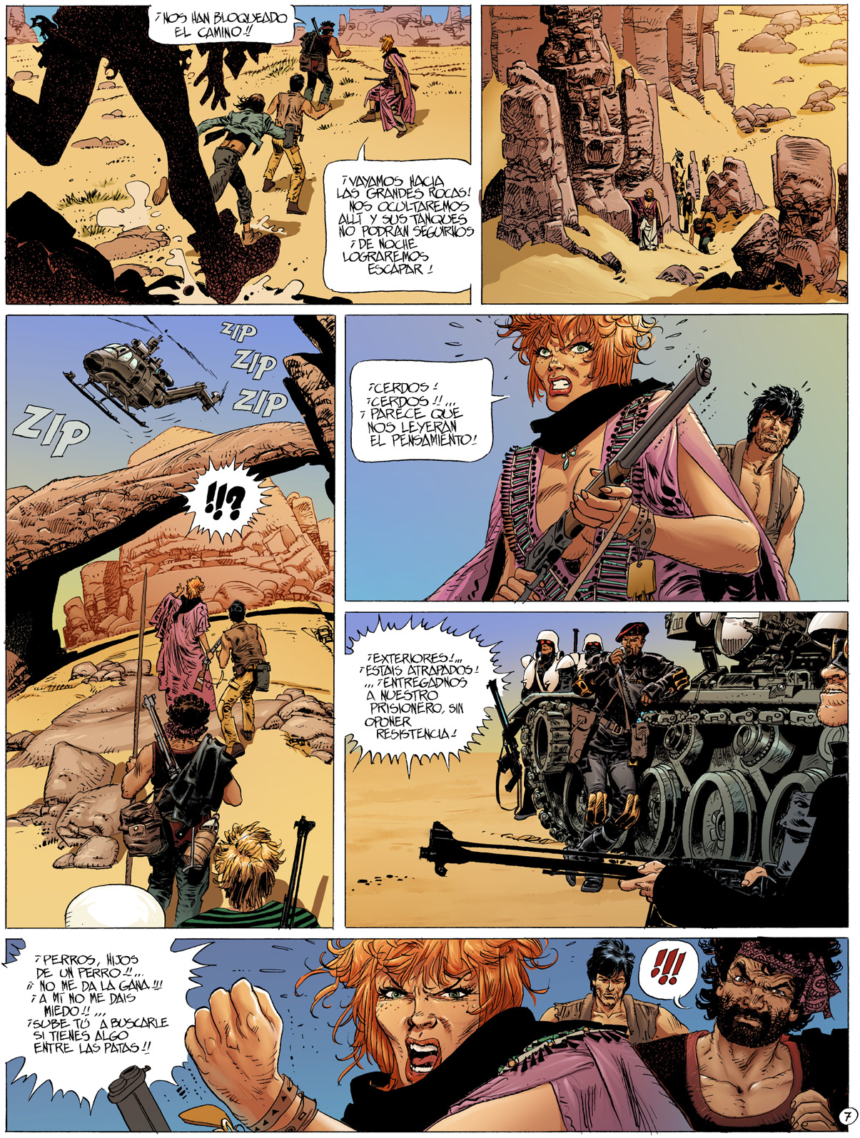 El tercer tebeo de habla hispana que quiero recomendarles hoy es la reedición de El prisionero de las estrellas, considerada como uno de los mejores cómics de ciencia ficción de nuestro país. Su autor, Alfonso Font, nos presenta un futuro distópico con ecos de la saga cinematográfica Mad Max o incluso de la por aquel entonces novedosa Terminator en el que la humanidad se divide en dos grupos: la mayor parte vive bajo la superficie bajo un régimen policial, mientras que una minoría (a los que llaman “los exteriores”) sobrevive como puede en la superficie bajo condiciones infrahumanas y azotados por un sol cada vez más inclemente. El protagonista de la historia, al que solo conocemos como “El prisionero” y cuya peripecia puede recordar también al del protagonista de la serie de televisión homónima y hoy de culto, decide huir a la superficie para descubrir que una droga que le inocularon lo convierte en un reo de sus propias pesadillas esté donde esté. Lamentablemente, este relato de imaginación desbordante que se publicó por capítulos en la añorada revista Cimoc quedó inconcluso; pero el espectacular arte del autor de títulos como Clarke & Kubrick, Taxi o La flor del Nuevo Mundo, deudor tan obvio como gozoso de maestros de la BD francobelga de ciencia ficción como Paul Gillon, Moebius, Juan Giménez o Enki Bilal, justifica con creces su lectura.