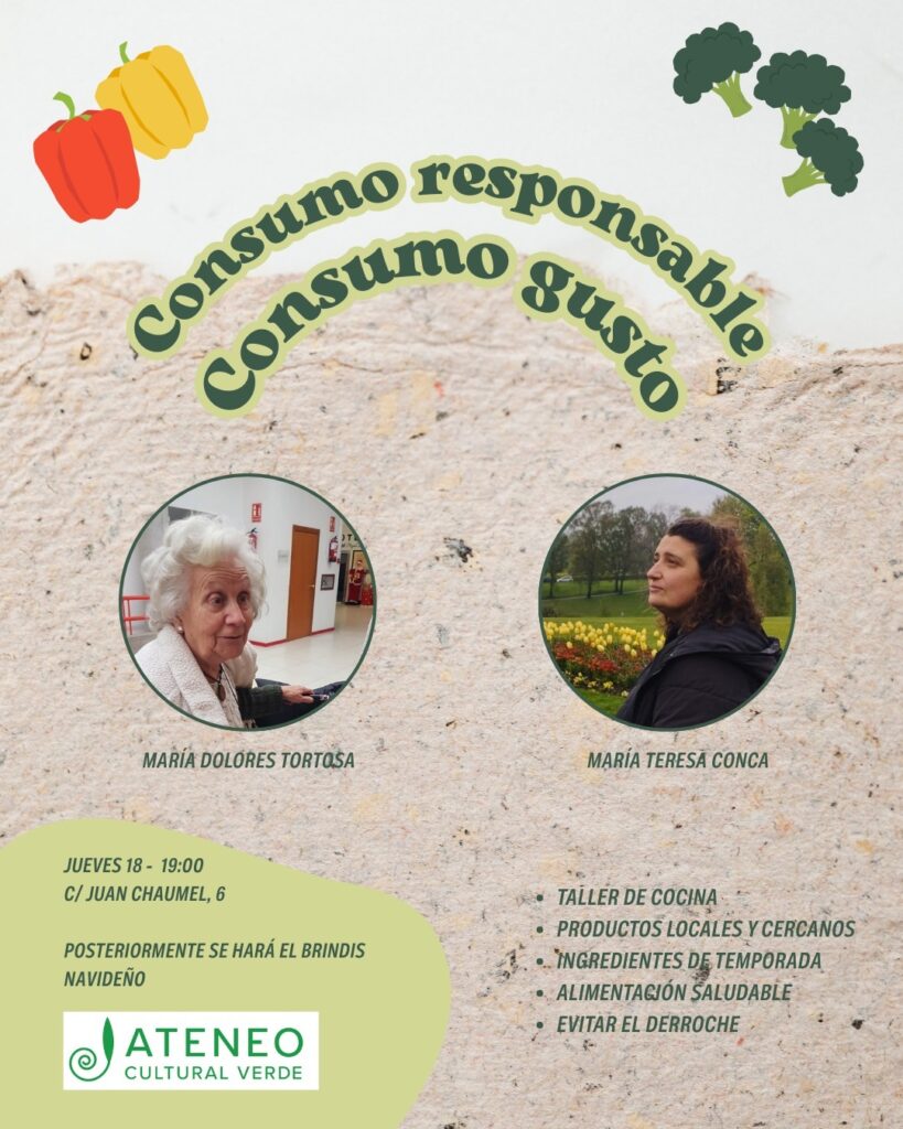 En unas fechas marcadas tradicionalmente por el exceso, el Ateneo Cultural Verde apuesta por el encuentro, la reflexión y el consumo consciente. El próximo jueves 18 de diciembre, a las 19.00 horas, celebrará una nueva sesión bajo el título “Consumo Responsable, Consumo Gusto”, en la sede de Verdes de Europa, situada en la calle Juan Chaumel de Villena, nº 6, con entrada libre hasta completar aforo.