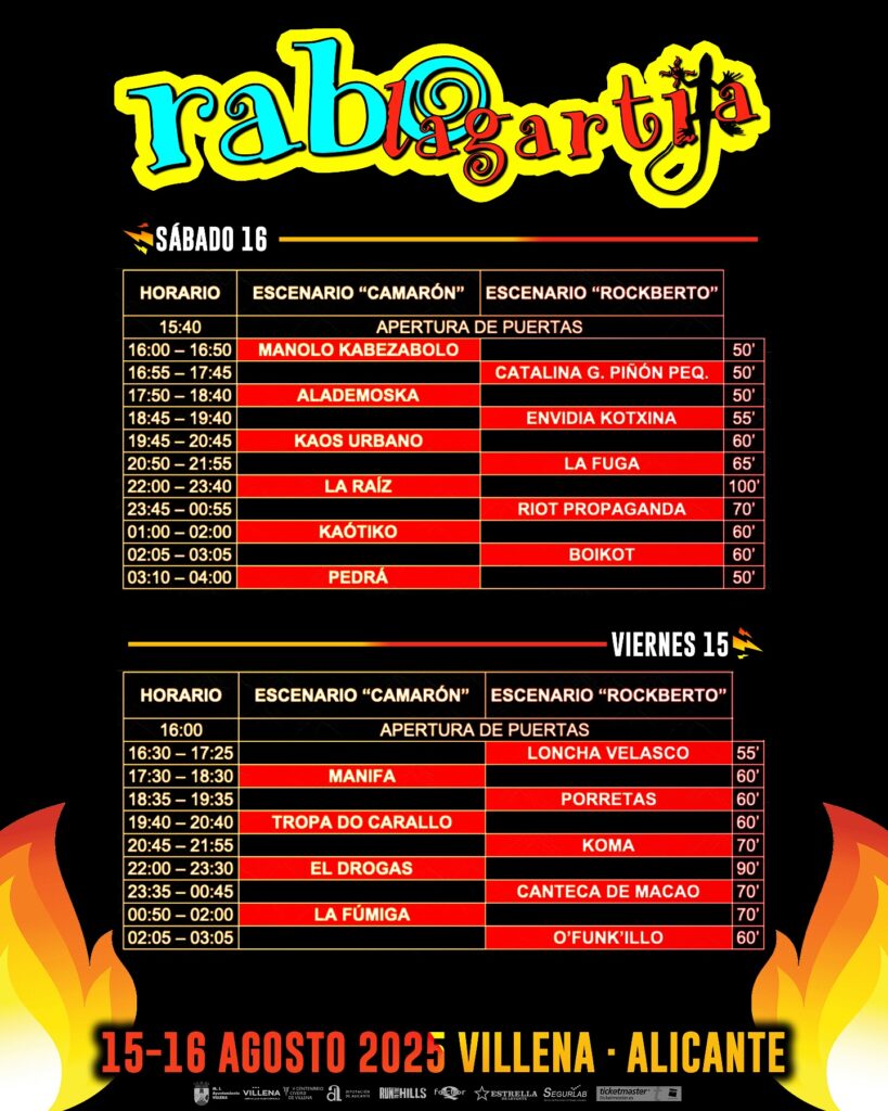 Villena, que acaba de acoger de forma totalmente exitosa una nueva edición del festival Leyendas del Rock, da ahora paso a su segundo gran festival, Rabolagartija, que se celebrará los días 15 y 16 de agosto en el mismo espacio, el polideportivo municipal, compartiendo montaje e infraestructuras con su hermano mayor.