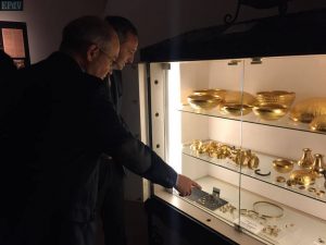 Posteriormente, la comitiva se trasladaba hasta el ayuntamiento, donde el Presidente conocía el Tesoro de Villena y firmaba en el Libro de Honor de la ciudad, recibiendo como recuerdo de su visita, de manos del alcalde, un ejemplar de la Historia de Villena de José María Soler. A continuación, entraban al salón de actos, ocupado en esta ocasión por los diputados provinciales, mientras los invitados tomaban asiento en el espacio destinado al público.