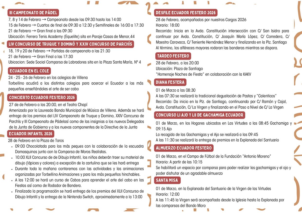 Por lo demás, la normalidad es la nota reinante. El tradicional desfile del Ecuador tendrá lugar el sábado 28 de febrero por la tarde, manteniendo el formato de los últimos años: un desfile de cargos que partirá de la Avenida de la Constitución a la altura de la calle San Isidro. Tras el mismo, a las 20 horas, la fiesta seguirá en la plaza de Santiago con un tardeo amenizado por el grupo musical Arracada.