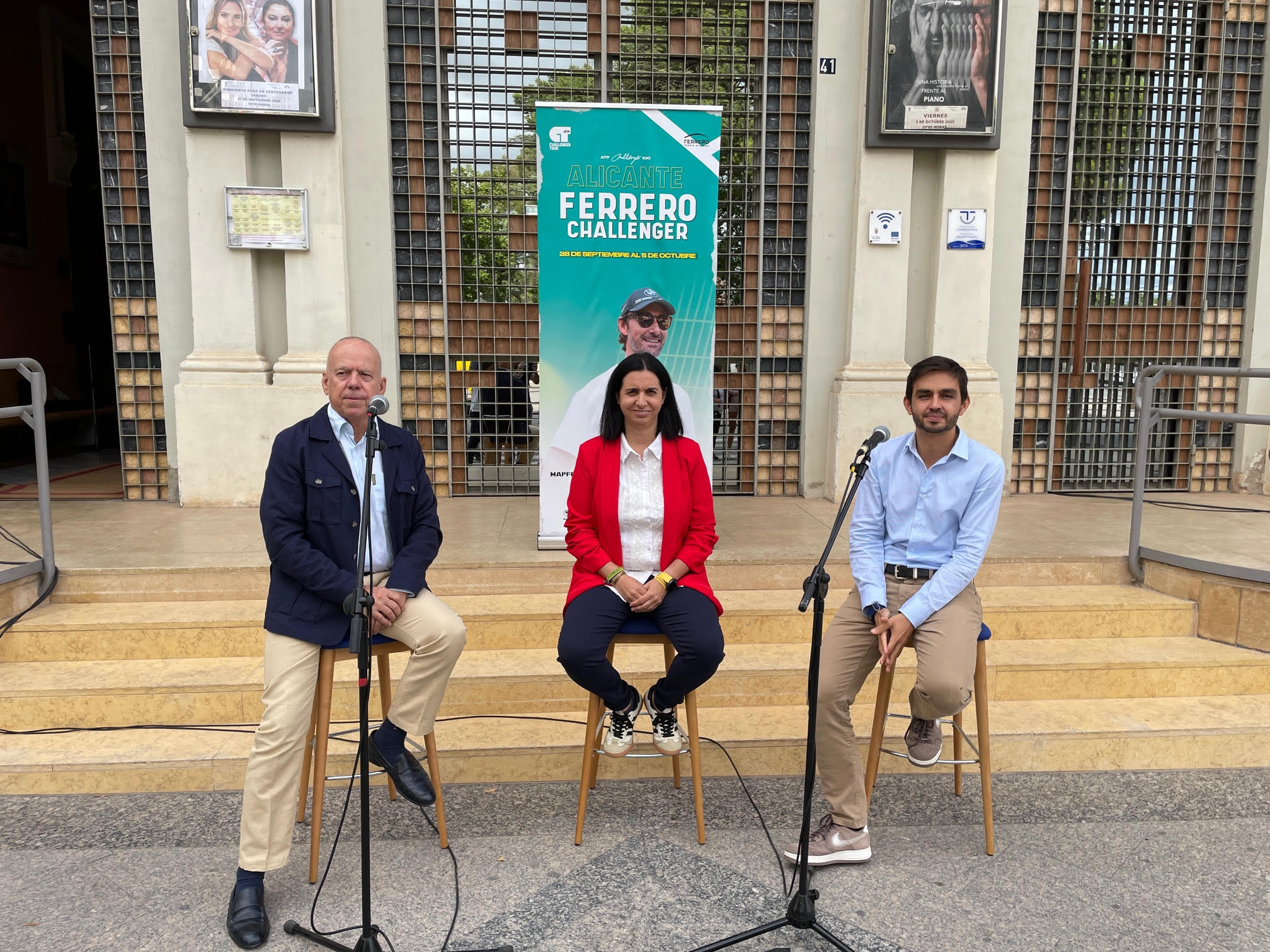La fachada del Teatro Chapí, en el año que conmemora su centenario, ha sido el escenario elegido para presentar el Alicante Ferrero Challenger, uno de los tres mejores torneos de tenis de la Comunidad Valenciana, que arranca este domingo con una jornada de puertas abiertas y que durante toda la semana nos permitirá disfrutar en Villena de un tenis de altísimo nivel.
