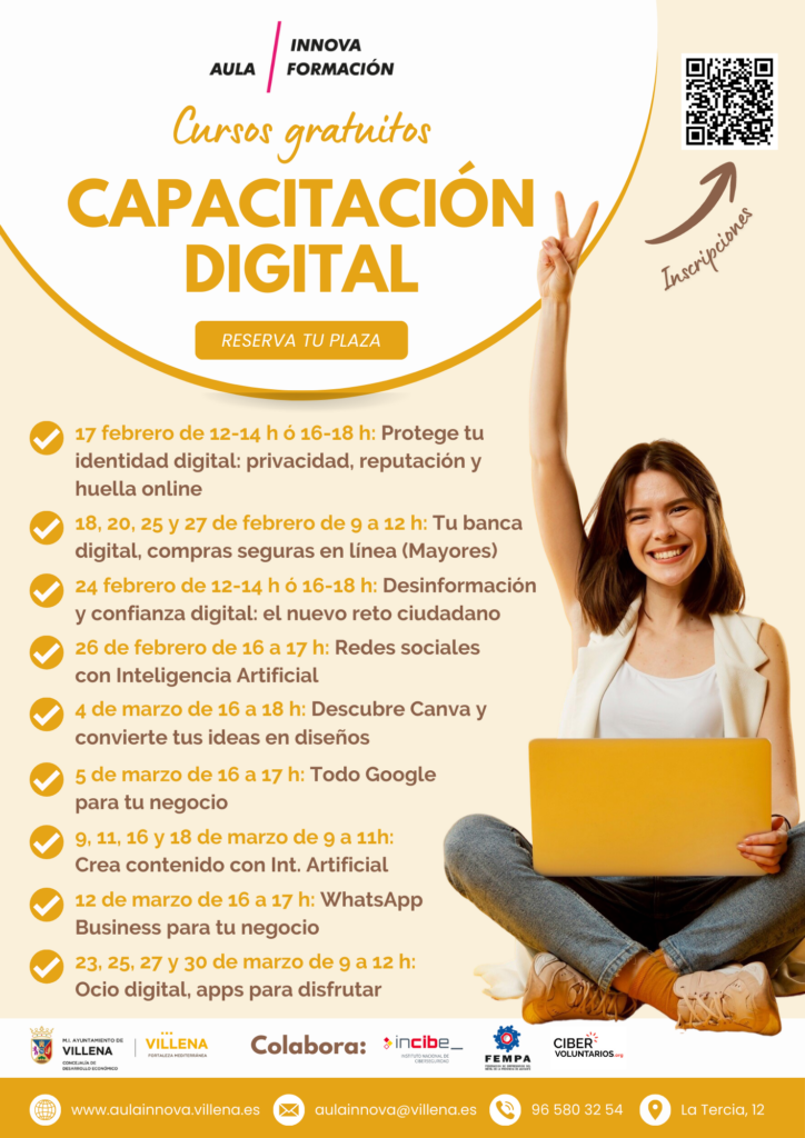 El Aula Innova Formación de Villena refuerza su compromiso con la inclusión y la capacitación digital de la ciudadanía con una completa oferta de charlas, talleres y cursos gratuitos durante el primer trimestre de 2026. La iniciativa está abierta a cualquier persona interesada, con especial atención a colectivos en riesgo de exclusión digital.