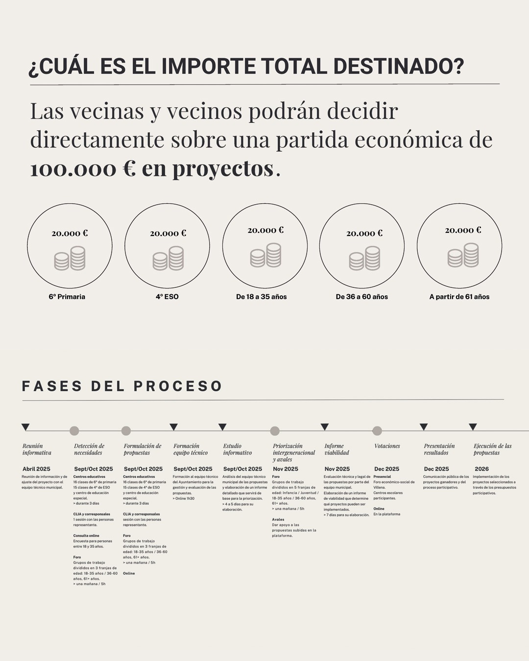 El Ayuntamiento anima a la ciudadanía a consultar toda la información sobre plazos y mecanismos de participación en la web municipal, recordando que la implicación colectiva es clave para decidir, entre todas y todos, las acciones que transformarán Villena en 2026: https://www.villena.es/participa/