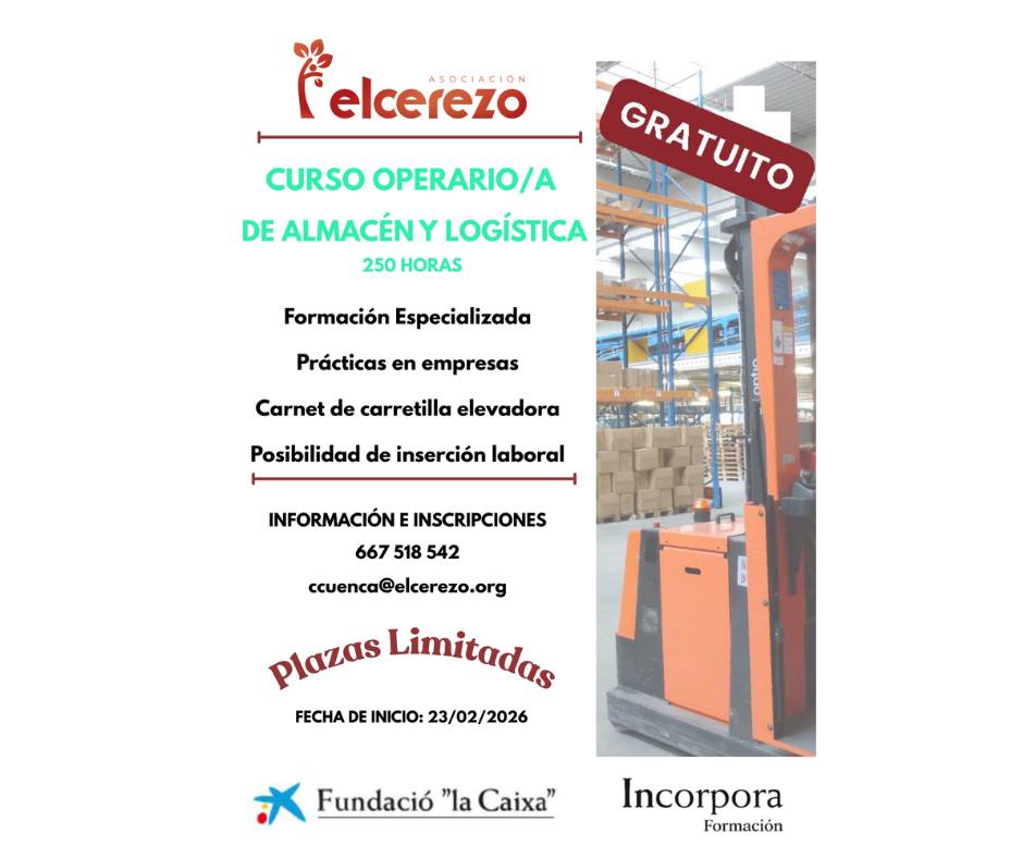 El próximo 23 de febrero comienza en Villena el curso de Operario/a de Almacén y Logística, una formación 100 % gratuita orientada a mejorar la empleabilidad y facilitar la inserción laboral directa en el sector logístico. El curso se prolongará hasta el 15 de mayo e incluye prácticas en empresa dentro del propio periodo formativo.