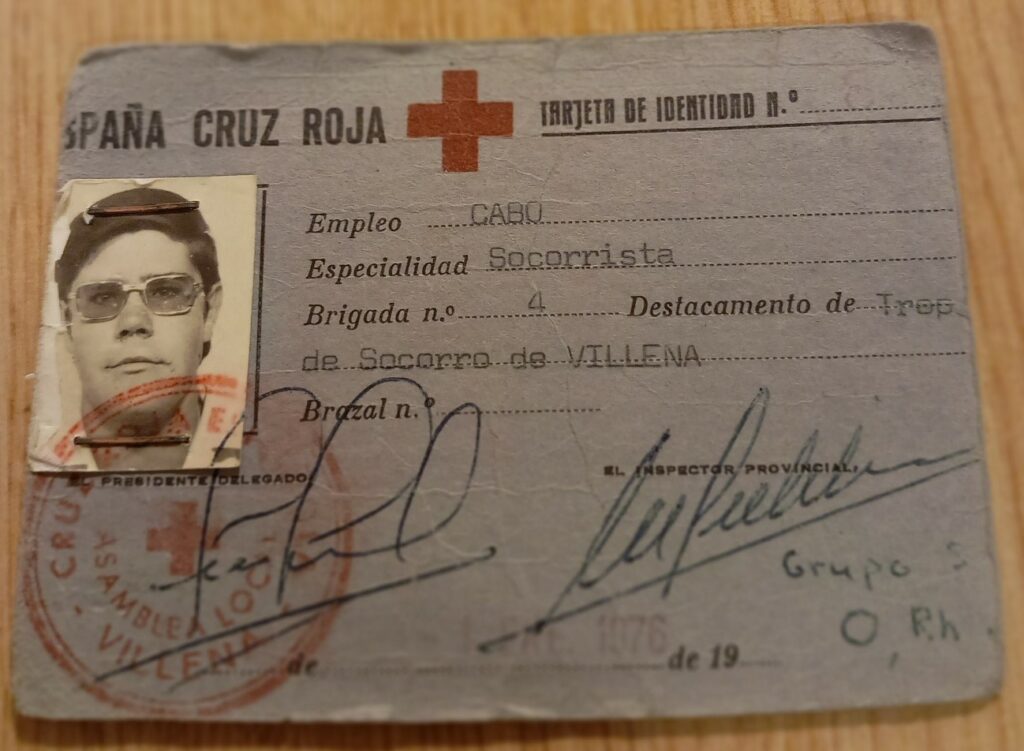 Ingresé en Cruz Roja el 1 de enero de 1976, siendo el carnet nº 8. Antes iban el presidente, Francisco Prats; los mandos, Brigada José Silva, y Sargento Carmelo Nieto; y luego los 4 valientes, los únicos cabos de todo el destacamento. Cabos, porque se lo merecían, ya que durante varios años, sin haber aún sede local, cogían la ambulancia municipal, un Simca 1200 donado por la Caja de Ahorros del Sureste de España y se iban a hacer servicios, más o menos por donde ahora está el cuartel de la Guardia Civil, porque por allí pasaba la carretera nacional que venía de Madrid; o bien se desplazaban hasta Sax, donde sí había asamblea Local (ellos inicialmente estaban allí integrados) y en las inmediaciones del Club Oasis, también en la carretera de Madrid, donde había una rasante muy peligrosa. La Cruz Roja de Villena no hubiera existido sin la determinación de ellos, que no solo se entregaron generosamente al servicio a los demás, sino que al unísono procuraron hacerla más grande. ¡Y vaya si lo consiguieron!