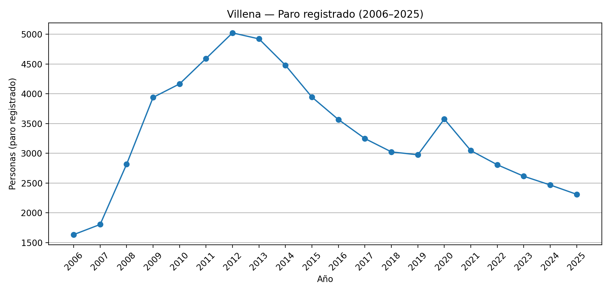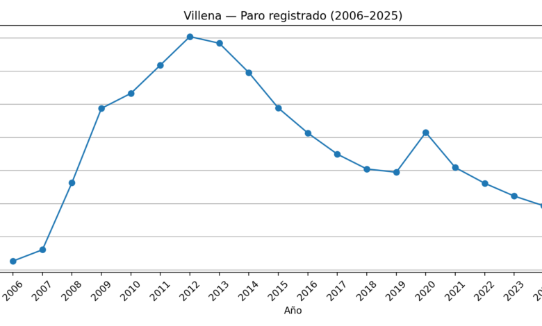 En 2006, antes del estallido de la burbuja inmobiliaria, Villena registraba algo más de 1.600 personas en situación de desempleo. Era un nivel relativamente contenido que se vio alterado de forma abrupta a partir de 2008.
