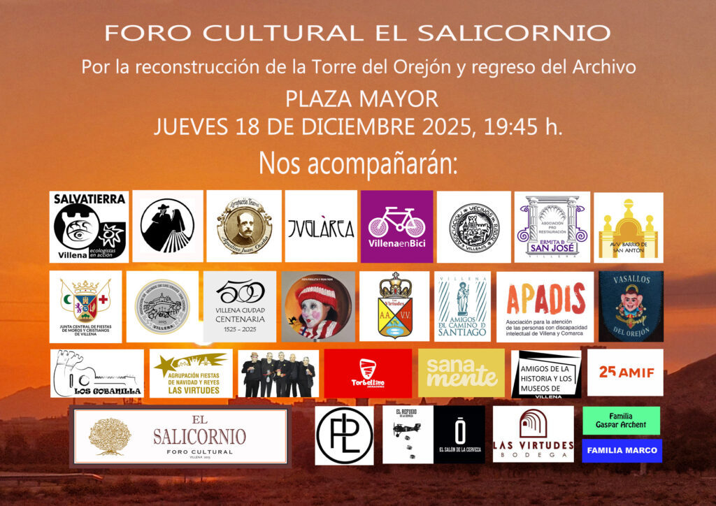 Tenemos el honor de invitaros, el jueves 18 de diciembre, a las 19:45 en la Plaza Mayor, al encuentro mensual (extraordinario por la celebración de la Navidad) en el que reivindicamos la construcción de la Torre del Orejón y la vuelta a Villena del Archivo Municipal.