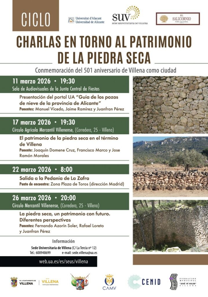 Con motivo de la conmemoración del 501 aniversario de Villena como ciudad, el Foro Cultural El Salicornio, en estrecha colaboración con la Sede Universitaria de Villena de la Universidad de Alicante, organiza un ciclo de conferencias dedicado al patrimonio inmaterial de la piedra seca.