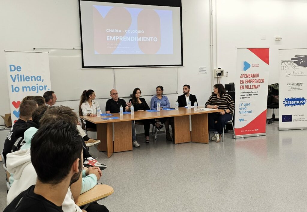 Comerciantes de Villena compartieron el pasado jueves sus experiencias con el alumnado del IES Las Fuentes en una charla-coloquio centrada en el emprendimiento comercial como opción profesional.