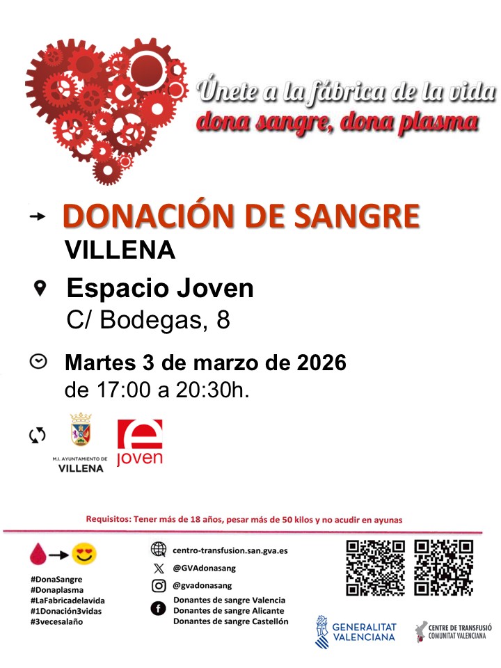 Este martes, de marzo, hay convocada una nueva donación de sangre por el Centro de Transfusión de la Comunidad Valenciana, en esta ocasión en el Espacio Joven, en la calle Bodegas.