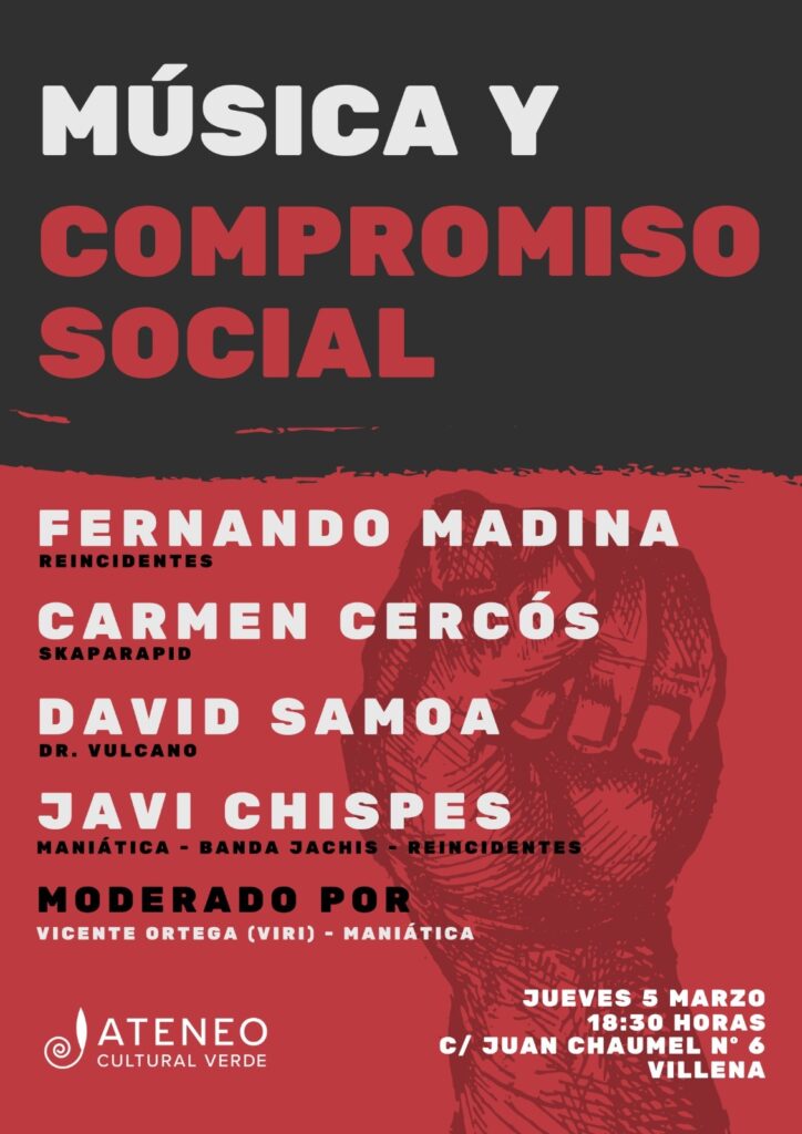 El próximo jueves 5 de marzo a las 18:30 horas, el Ateneo Cultural Verde celebrará una nueva cita dentro de sus encuentros mensuales con una actividad centrada en la música reivindicativa y su papel transformador en la sociedad. El acto tendrá lugar en la calle Juan Chaumel, 6 de Villena, con entrada gratuita hasta completar aforo.