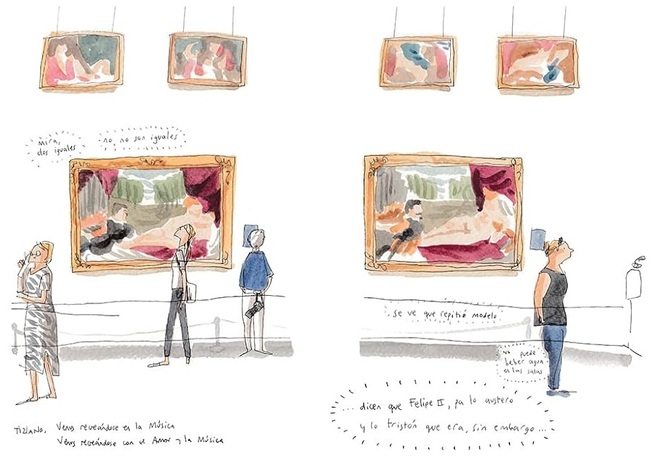 Uno de los cuadros recogidos en el libro de Wilson, El descendimiento de Rogier van der Weyden, puede ser contemplado en todo su esplendor en una de las salas del Museo del Prado de Madrid. Pues precisamente a esta institución está dedicada otra novedad editorial que también funciona como guía, si bien desde una perspectiva menos academicista y más artística en sí misma. Porque este es precisamente el caso de Cuaderno del Prado, libro ilustrado con el que la dibujante y ceramista madrileña Ximena Maier deja constancia de sus visitas habituales al museo más famoso de nuestro país: a medio camino entre el libro ilustrado y el cómic, este cuaderno de notas y bocetos propone una mirada subjetiva sobre la colección pictórica que alberga el lugar, recomendando rutas concretas y comentando las obras favoritas (y también las menos) de su autora; a la vez que recoge de paso las reacciones de los visitantes y el funcionamiento interno del museo, área de restauración incluida.