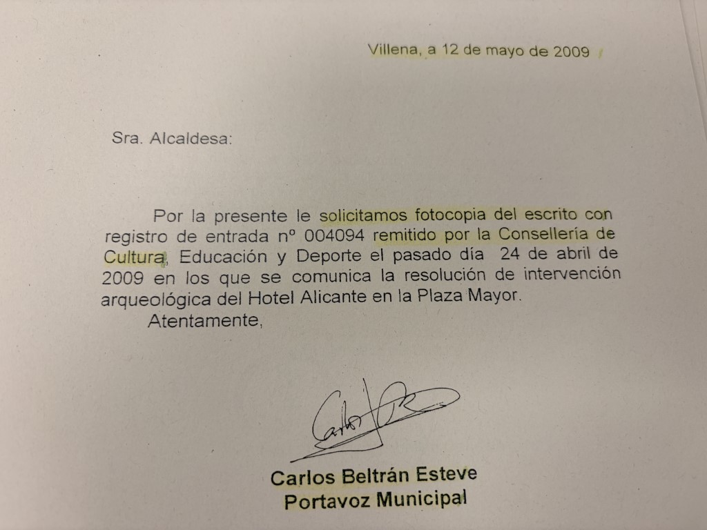 En abril de 2009, Patrimonio autorizó una intervención arqueológica inicial de 15 días, estableciendo los plazos habituales para informes y memorias (informe preliminar sobre los restos encontrados en un plazo de un mes, memoria inicial en 8 meses y memoria científica en 2 años). Esta autorización fue comunicada al PSOE, que incluso solicitó copia formal a través de su entonces portavoz, Carlos Beltrán, recibida al día siguiente a través del entonces concejal de Cultura, Francisco Abellán.