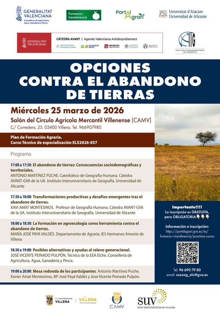 Sin apenas pausa en la actividad cultural, el próximo 25 de marzo el CAMV acogerá, entre las 17:00 y las 20:00 horas, un curso incluido en el Plan de Formación Agraria de la Generalitat Valenciana. La sesión, titulada “Opciones contra el abandono de tierras”, estará dirigida por el villenense Antonio Martínez Puche, catedrático de Geografía Humana de la Universidad de Alicante, y se celebrará en el salón principal del edificio situado en la calle Corredera.