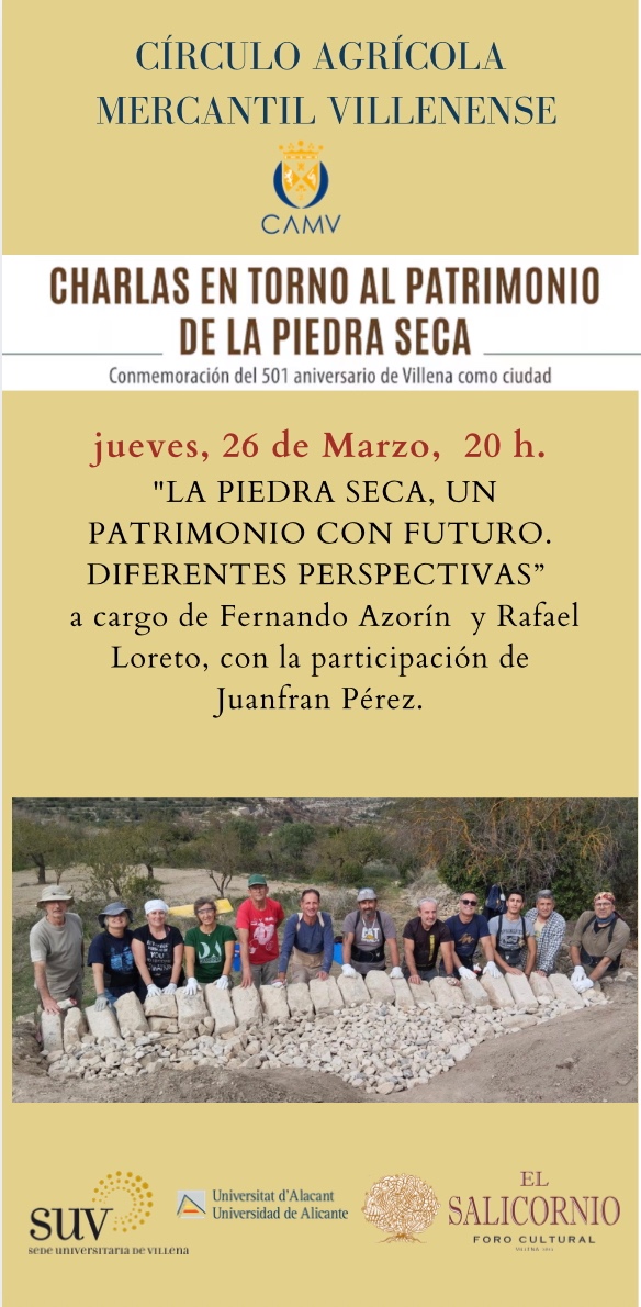 La agenda continuará el 26 de marzo con una doble propuesta cultural. A las 17:30 horas tendrá lugar una nueva sesión del ciclo de conferencias “Fe, Cultura y Ciencia”, que viene registrando una notable asistencia de público. Posteriormente, a las 20:00 horas, se celebrará la conferencia “La piedra seca, un patrimonio con futuro. Diferentes perspectivas”, organizada por el foro cultural El Salicornio con la colaboración de la Sede Universitaria y el CAMV. La charla contará con las intervenciones de Fernando Azorín y Rafael Loreto, así como la participación de Juanfran Pérez.