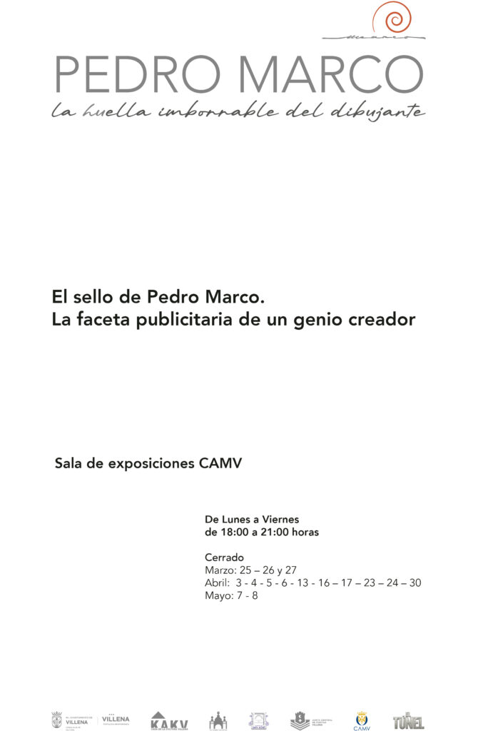 La programación continuó el 20 de marzo con la inauguración, a las 19:00 horas, de la exposición antológica dedicada al artista Pedro Marco, bajo el título “La huella imborrable del dibujante”. Esta muestra, organizada en colaboración con la KAKV y el Ayuntamiento de Villena, profundiza también en la vertiente publicitaria del creador a través de la exposición “El sello de Pedro Marco. La faceta publicitaria de un genio creador”, invitando a vecinos y visitantes a descubrir o redescubrir su legado.