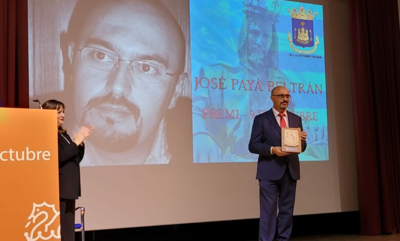 Durante el acto, la alcaldesa, Magdalena Martínez, entregó el Premio 9 d’Octubre a José Payá Beltrán, escritor, profesor, actor y según sus palabras “un hombre polifacético”. En su intervención, Payá puso en valor la cultura que nace desde la base, impulsada por quienes sostienen el tejido social del municipio y destacó el valor de este premio. “Quien lo otorga no es uno, sino el conglomerado, la malla y el tejido a partir del cual se basa nuestra cultura”, subrayó.