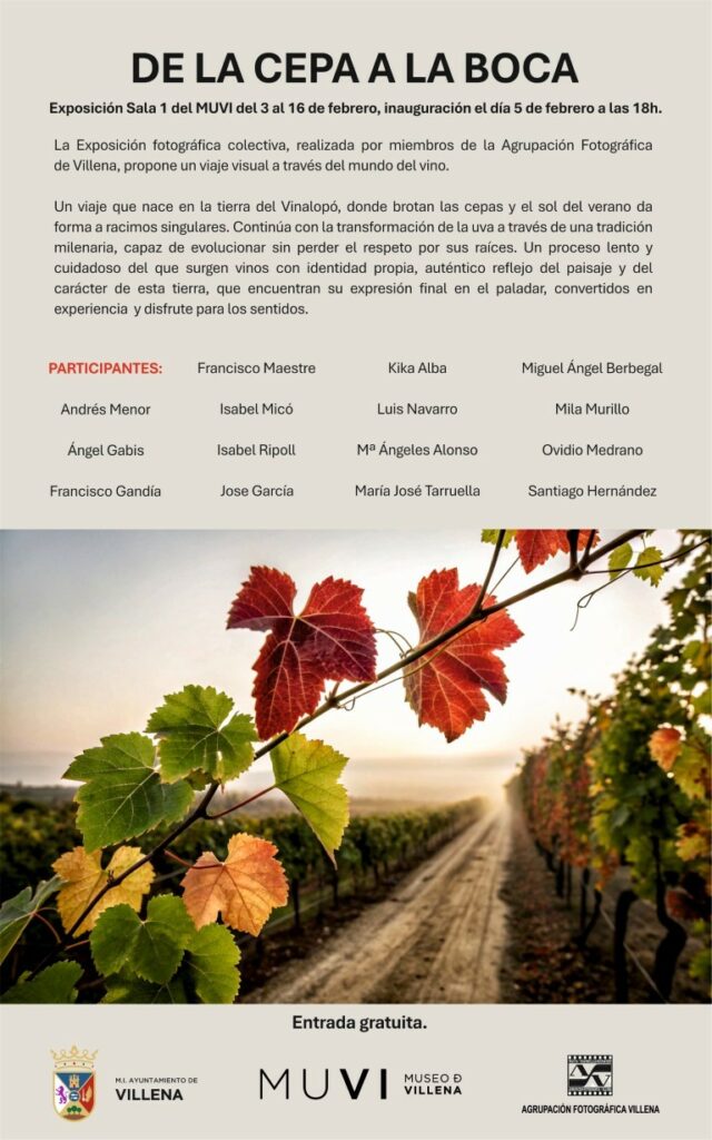 La Agrupación Fotográfica de Villena (AFV), junto a la concejalía de Turismo del Ayuntamiento de Villena, presenta la exposición fotográfica “De la cepa a la boca”, una muestra colectiva enmarcada dentro de las actividades organizadas con motivo de la feria del vino Enotur.