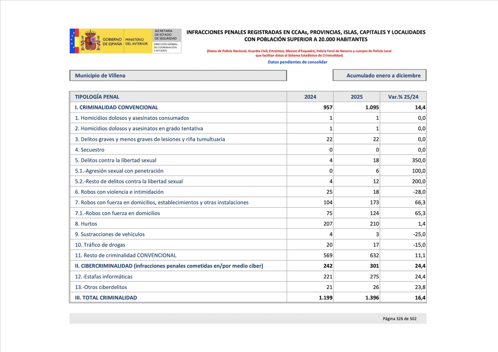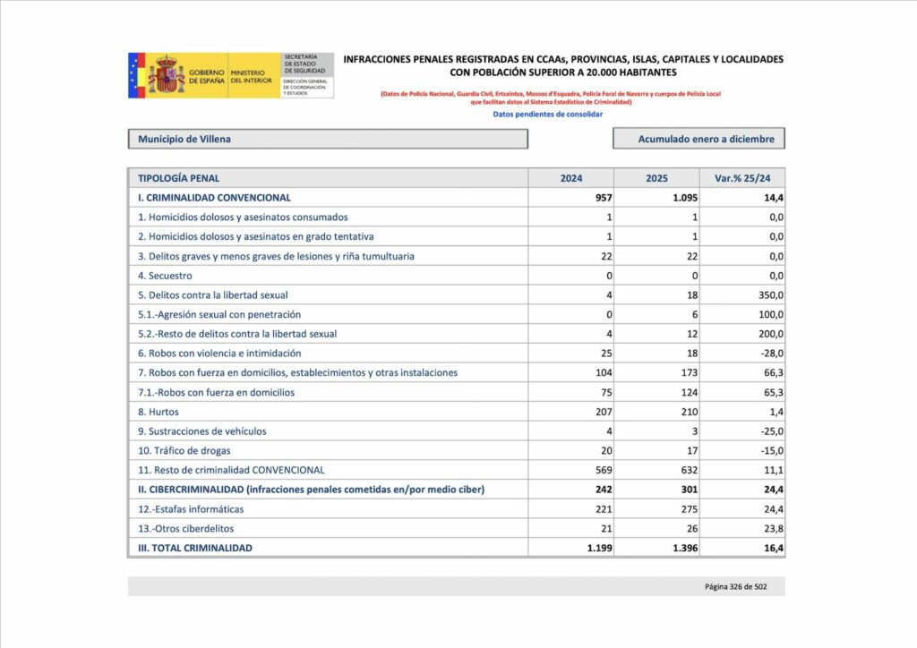La criminalidad en Villena experimentó un notable incremento durante 2025, con un aumento global del 16,4% respecto al año anterior, según los datos oficiales del balance de criminalidad del Ministerio del Interior correspondientes al acumulado de enero a diciembre. Pueden descargar el informe íntegro aquí.