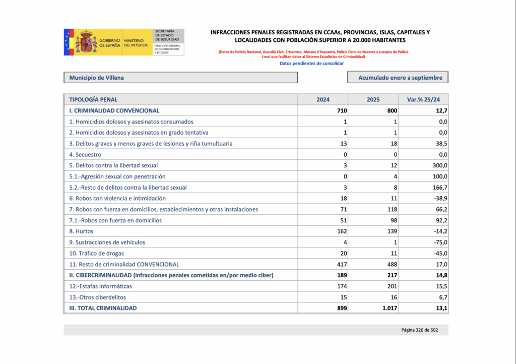 Estos datos convierten a Villena en la quinta ciudad de la provincia en la que más aumentan en los delitos en este periodo de 2025 en comparación con el mismo periodo de 2024, por detrás de Novelda, Mutxamel, Crevillente y Almoradí.