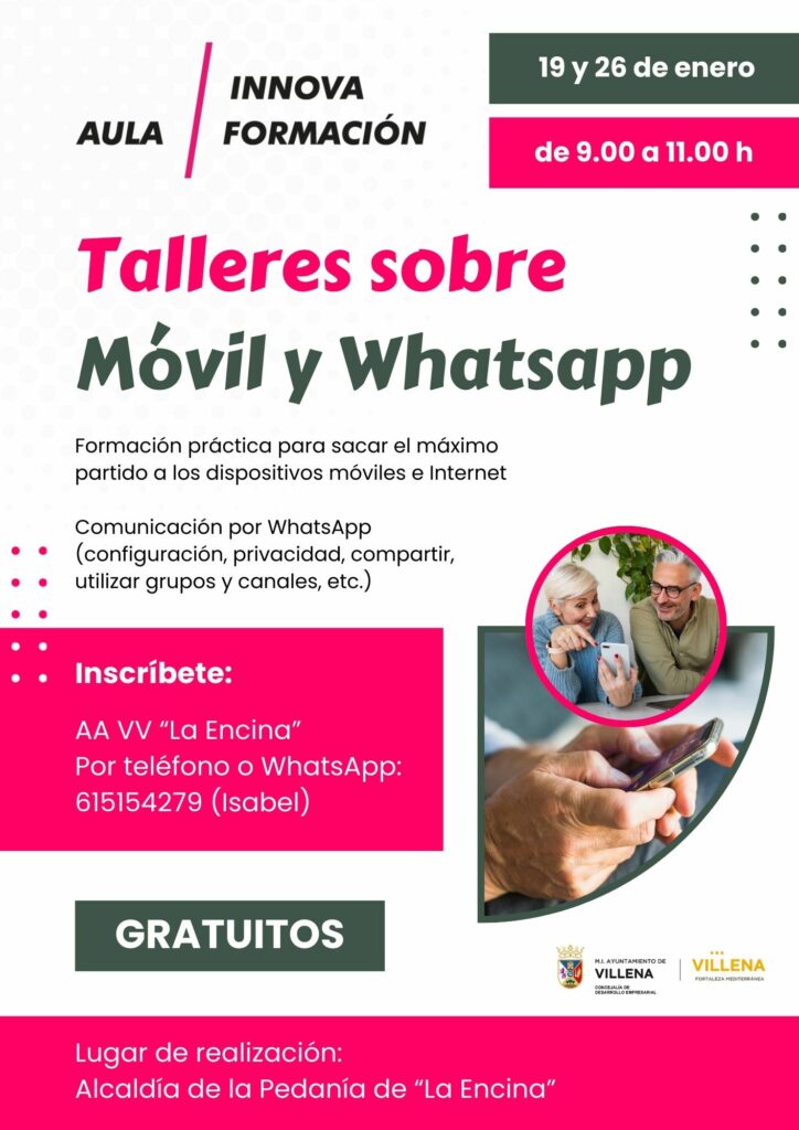 La pedanía de La Encina acogerá los próximos días 19 y 26 de enero dos talleres prácticos de formación digital organizados por Aula Innova Formación, con el objetivo de ayudar a sacar el máximo partido a los teléfonos móviles, Internet y la aplicación WhatsApp.
