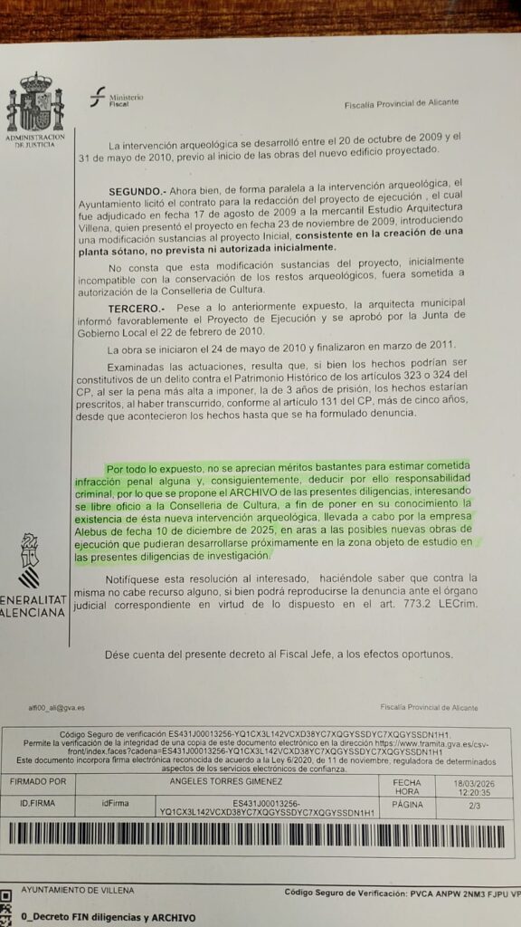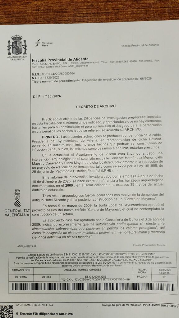 Tal y como ha informado esta mañana Javier Martínez, la Fiscalía Provincial de Alicante ha decretado el archivo de las diligencias de investigación abiertas por la destrucción de restos arqueológicos en el entorno de la Plaza Mayor, al considerar que los hechos, aun pudiendo ser constitutivos de delito contra el patrimonio histórico, habrían prescrito al haber transcurrido más de cinco años desde su comisión hasta la presentación de la denuncia.