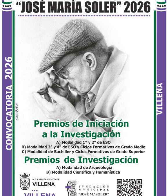 La Fundación José María Soler ha abierto hoy el plazo de presentación de trabajos para los Premios de Investigación y de Iniciación a la Investigación de 2026, que se extenderá hasta el 15 de mayo, cuyas bases se pueden consultar en www.villena.es/josemariasoler.