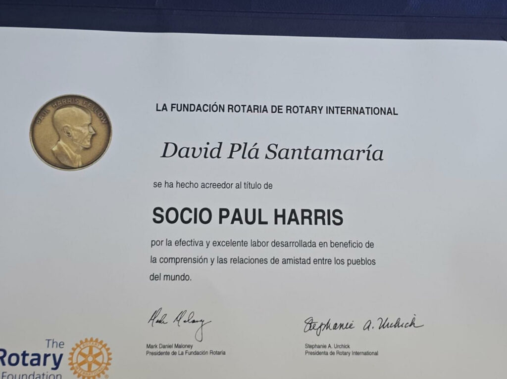El Rotary Club Villena se enorgullece en anunciar que su socio David Plá Santamaría ha recibido la distinción Paul Harris Fellow, concedida por la Fundación Rotaria de Rotary International.