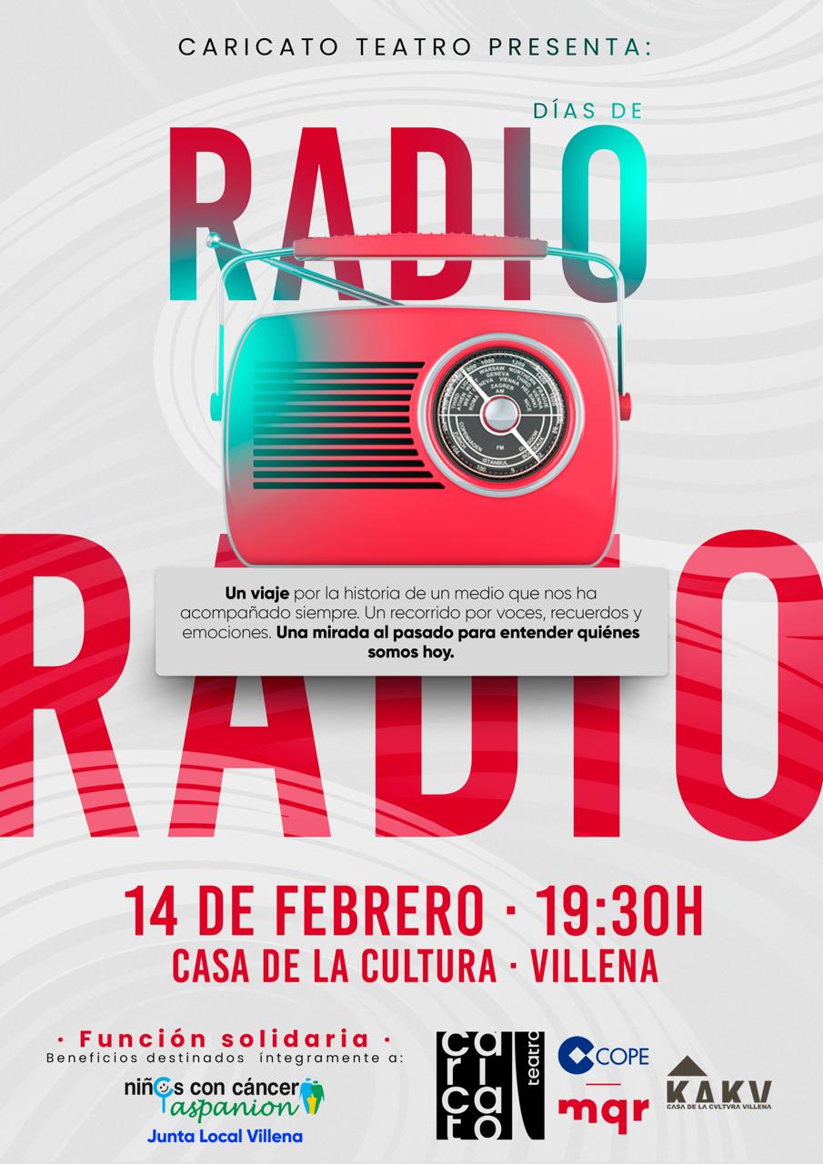 La función se enmarca dentro de la conmemoración del 25 aniversario de COPE Villena MQR, una emisora que ha acompañado durante dos décadas y media a varias generaciones de oyentes y que forma parte del día a día informativo y social de la ciudad. “Días de Radio” propone un viaje escénico por la historia de este medio de comunicación, desde sus primeras emisiones hasta su papel actual, poniendo el acento en las voces, las historias y los momentos que han quedado grabados en la memoria colectiva.