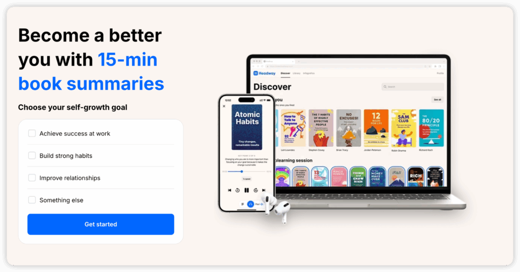 ¿Cómo funciona esta herramienta? En primer lugar, es totalmente personalizado. Solo debes responder a un cuestionario que evalúa tus intereses y necesidades; luego, los algoritmos seleccionan los mejores resúmenes de libros para tu hoja de ruta hacia el crecimiento personal y el éxito. Esa es la magia de la app Headway.