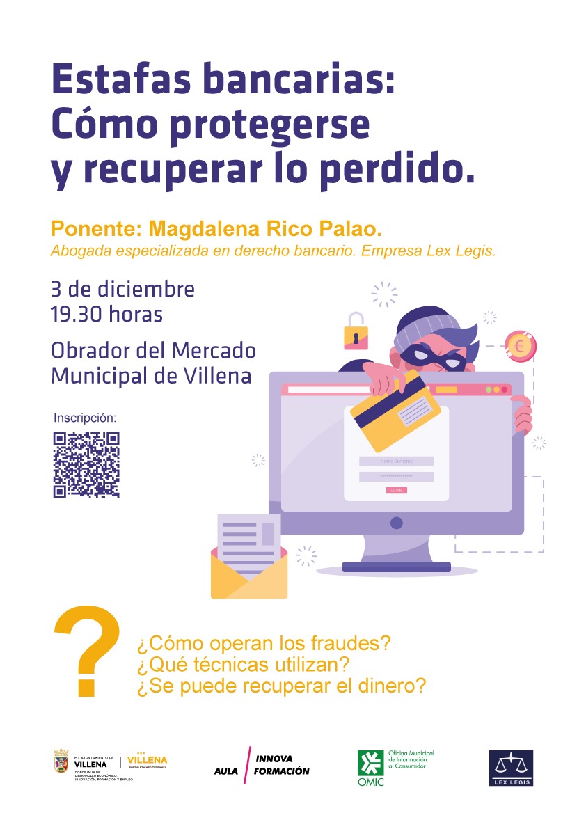Esta charla contará con la participación de Magdalena Rico Palao, abogada especializada en derecho bancario, quien abordará las estafas más comunes que afectan a los usuarios, incluyendo phishing, spoofing, la estafa del hijo en apuros y la estafa del hombre en el medio. Las inscripciones se deben realizar a través de: https://www.villena.es/innova-inscripciones/