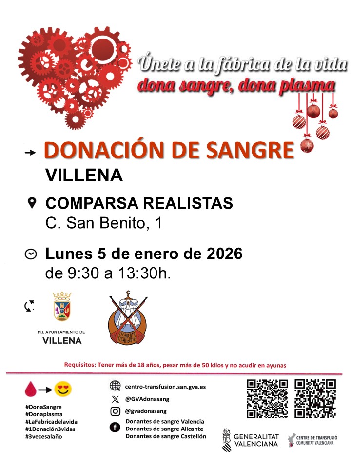 El próximo lunes, 5 de enero, hay convocada una nueva donación de sangre por el Centro de Transfusión de la Comunidad Valenciana, en esta ocasión en la la sede de la comparsa de Moros Realistas, en la calle San Benito, 1.