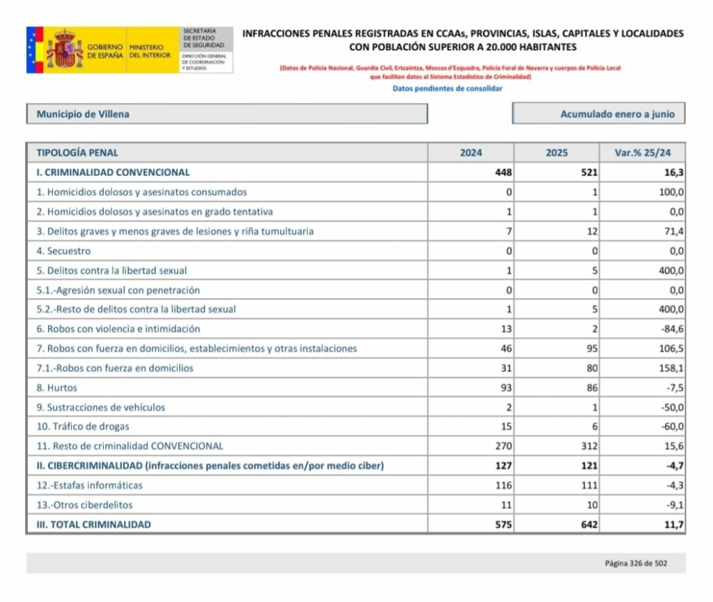 Asimismo, y frente a esos datos, Palao añadía que “tenemos otros datos, en este caso de la Policía Local, que apuntan que hay un 33% menos de detenidos o que los delitos de violencia de género, contra la seguridad ciudadana y contra la seguridad vial se mantiene estables”. Además, remataba, Villena, con 1.86 delitos por cada 100 habitantes, es la segunda ciudad de más de 20.000 habitantes de Alicante con menos delitos, pues la media es de 2.64 delitos por cada 100 habitantes, mientras que Alicante o Benidorm tienen 3.60 y Torrevieja supera los 5”.