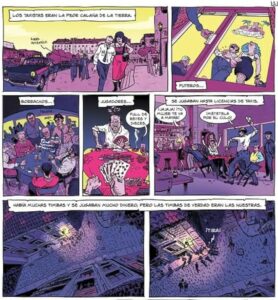 Precisamente cambiamos de tercio por completo al acercarnos a la adaptación de otro reportaje de índole social, y mucho más actual que el resto de novedades comentadas: Macarras interseculares es el ensayo que el periodista Iñaki Domínguez dedicó en 2020 a relatar cómo distintas tribus urbanas comenzaron a formarse dentro de las fronteras de Madrid desde la década de los sesenta y su evolución hasta llegar a la música electrónica y las drogas de diseño del siglo XXI, pasando por la epidemia de heroína en los ochenta, la revolución cultural que supuso la Movida y la importación del rap y el hip hop a lo largo de los noventa. Un lustro después, este valioso testimonio se ha convertido en una novela gráfica de manos de su responsable en colaboración con la ilustradora Marina Cochet, que logra captar a la perfección las diferentes estéticas de todos los grupos sociales recogidos en sus páginas. El resultado es una forma de acercarse a la capital tan castiza como la de los "barrios y estampitas" de los Entresijos de Víctor Coyote; con un dibujo por parte de Cochet que evoca por igual la línea chunga de El Víbora como el cómic estadounidense de corte indie, y que hará las delicias de los amantes de la cultura popular patria. Un cómic, en definitiva, a no perderse; como las otras tres adaptaciones que les recomiendo hoy.
