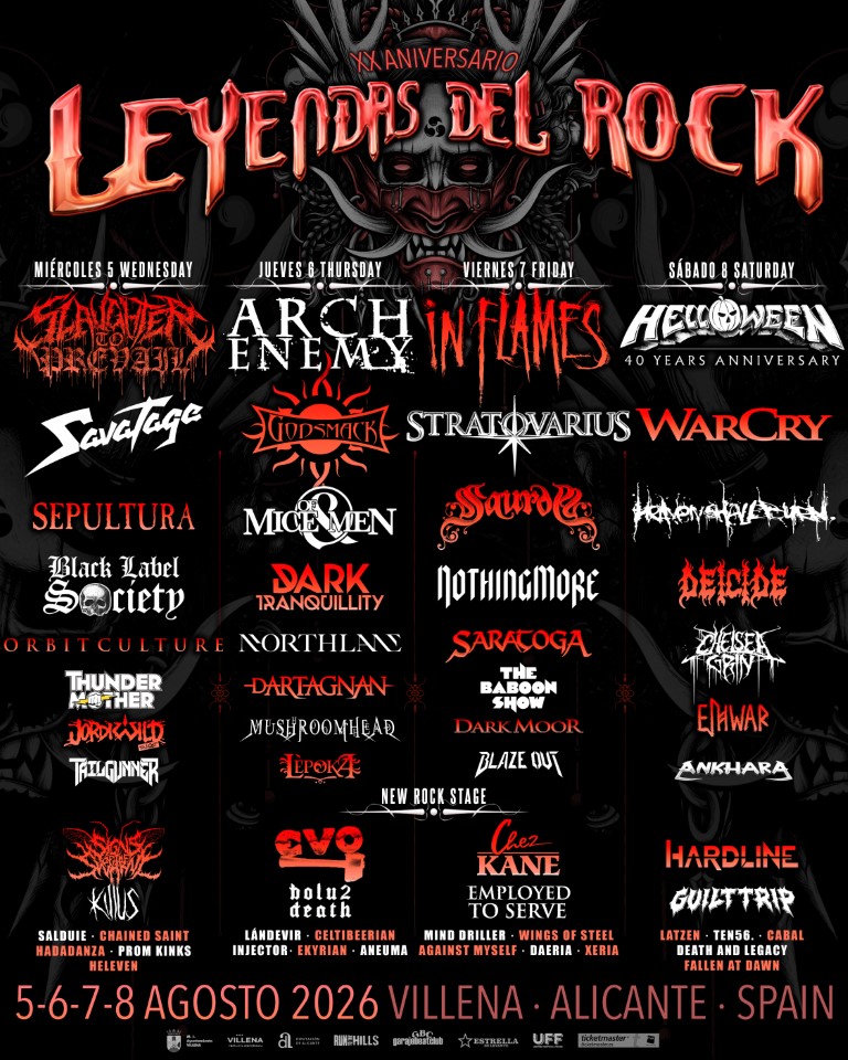 El XX aniversario de Leyendas del Rock se celebrará los días 5, 6, 7 y 8 de agosto, en Villena, Alicante, España, y supone el cartel más espectacular y ambicioso del veterano festival de heavy metal en toda su dilatada historia. Helloween, In Flames, Arch Enemy, Slaughter To Prevail, Savatage, Godsmack, Warcry, Sepultura, Black Label Society o Saurom, entre otras muchas propuestas, encabezan la atractiva y variada oferta para 2026.