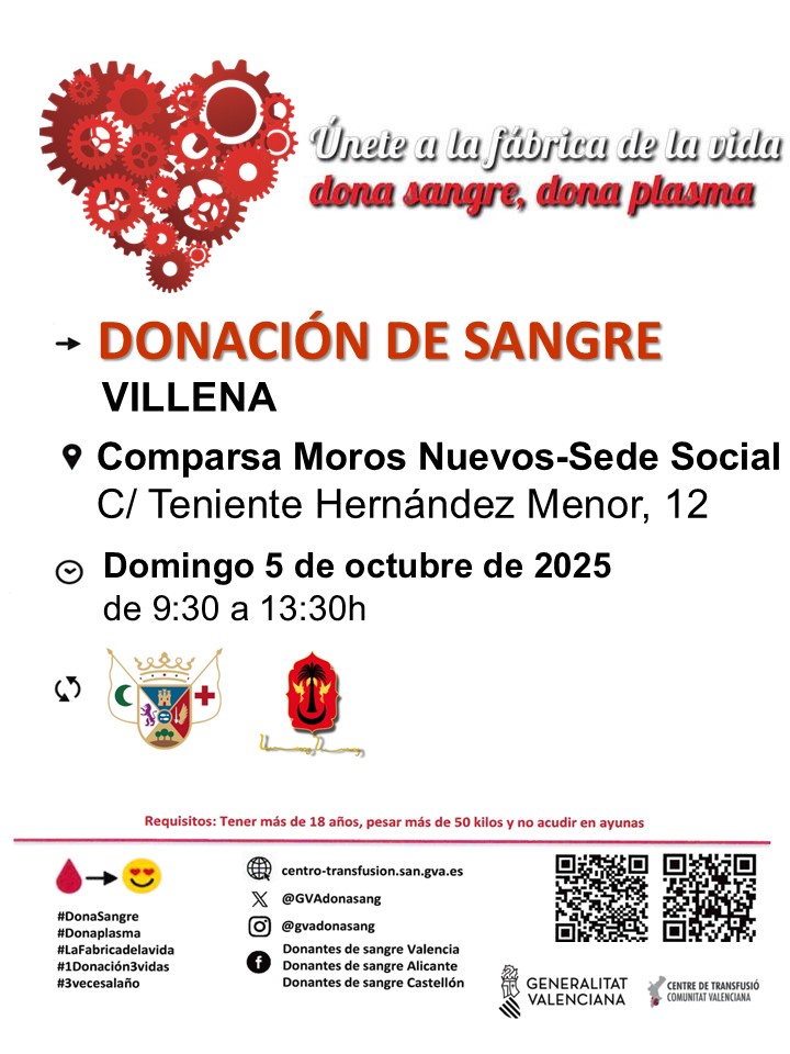 Este domingo, 5 de octubre, hay convocada una nueva donación de sangre por el Centro de Transfusión de la Comunidad Valenciana, en esta ocasión en la sede de la Comparsa de Moros Nuevos, en la Teniente Hernández Menor, 12.