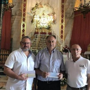 La comparsa de Moros Nuevos ha hecho entrega a la Junta de la Virgen de la recaudación obtenida en la rifa de Los 50 un Tesoro, importe que este año ha ascendido a 5.052 y se ha destinado íntegramente a la rehabilitación del trono de la Virgen.