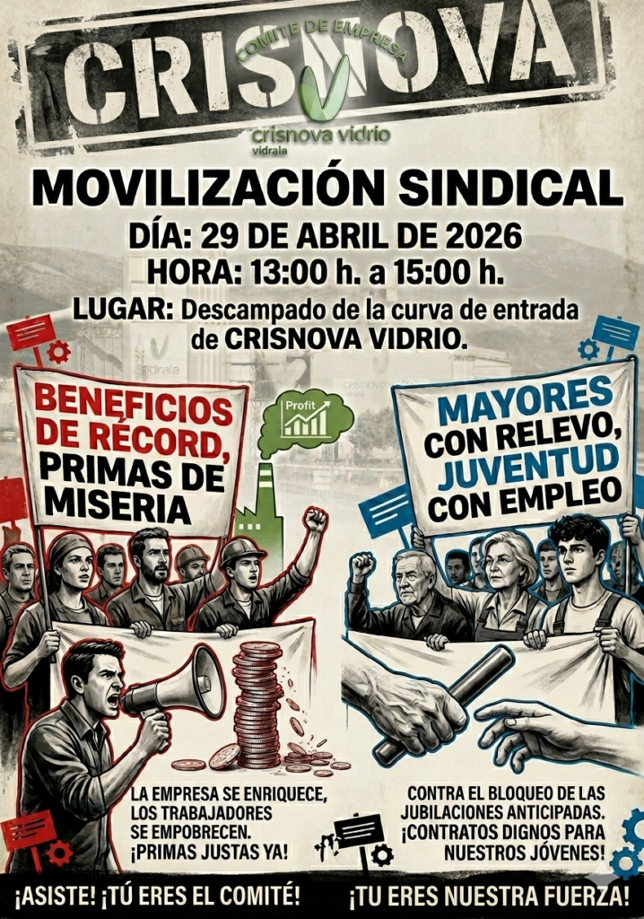 La plantilla de Crisnova, empresa ubicada en Caudete en la que trabajan muchos vecinos de Villena y comarca, ha convocado una movilización el próximo miércoles 29 de abril a las puertas de la fábrica para reclamar a la dirección primas más justas y el desbloqueo de las jubilaciones parciales, actualmente paralizadas por la empresa.