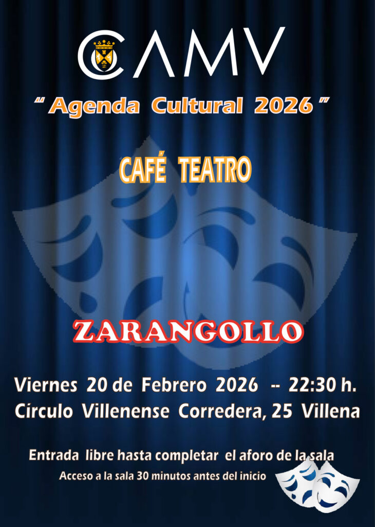En esta ocasión será el turno de ATAVI, que organiza un nuevo Café Teatro con la participación del grupo Zarangollo, que presentará una serie de números teatrales pensados para ofrecer al público una velada amena y cercana. La propuesta contará con una cuidada puesta en escena y la dirección de Andrés Gil, que guiará al grupo en una representación destinada a acercar al público la esencia del teatro.