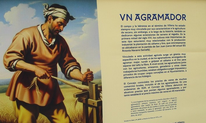 Aunque en el texto se habla larga y documentadamente de los agramadores durante los años en que se cultivaba el cáñamo en nuestra huerta, resulta que la figura que lo ilustra, seguida del cartel “Un Agramador”, ni tiene nada que ver con este oficio ni con lo que se dice en la literatura que lo acompaña, pues el personaje, dibujado en primer plano sobre un trigal al fondo, se dedica claramente, con un artilugio manual, a estrujar espigas para obtener su grano, por lo que el cartel debería decir algo así como “Un desgranador de espigas”.