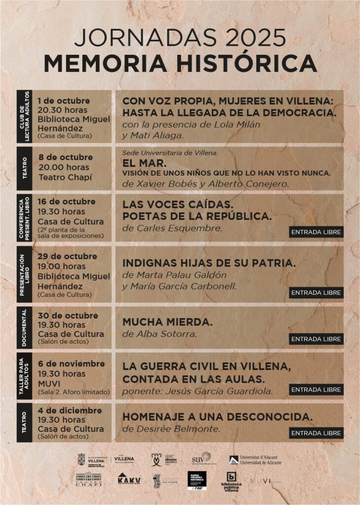 Las actividades arrancan hoy, 1 de octubre, con la reunión del Club de Lectura de la Biblioteca Miguel Hernández, que debatirá sobre el trabajo “Con voz propia, mujeres en Villena hasta la llegada de la democracia”, de Lola Milán y Mati Aliaga, que estarán presentes en el acto.