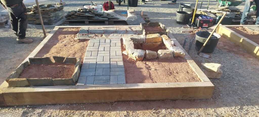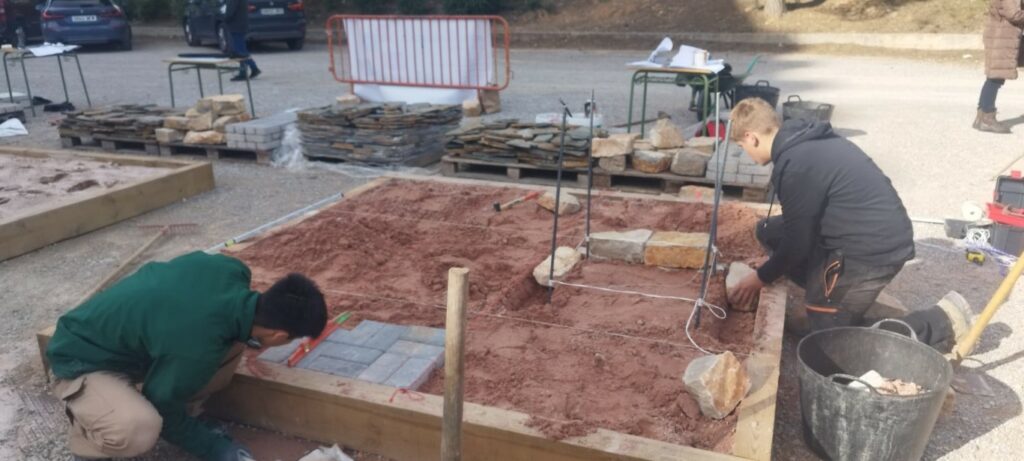 La prueba de la especialidad de Jardinería consistió en la realización de un camino de adoquines, un solado de lajas de pizarra, dos parterres con bordura de lajas y un estanque seco con piedra de mampostería, todo en un espacio de 2,5 x 2,5 metros. La organización proporcionó los materiales y los planos de diseño; cada equipo tenía que llevar sus propias herramientas. En este contexto, el equipo del IES Hermanos Amorós destacó por llevar la mayor variedad de materiales y herramientas, lo que mejoró la calidad final del trabajo.